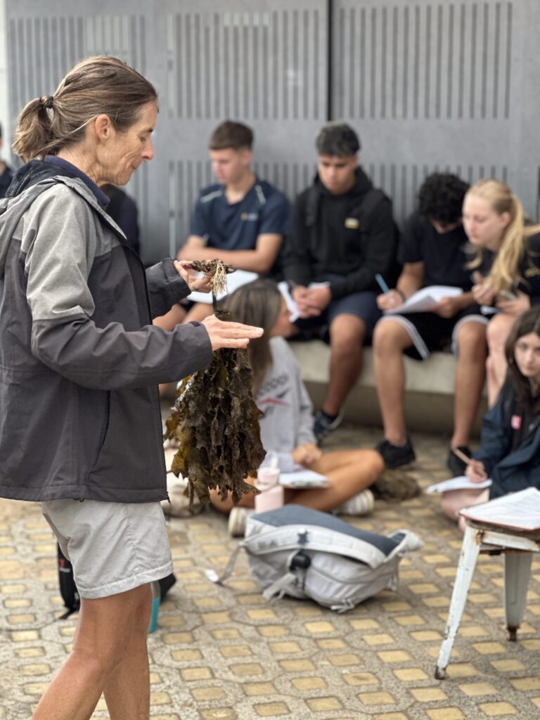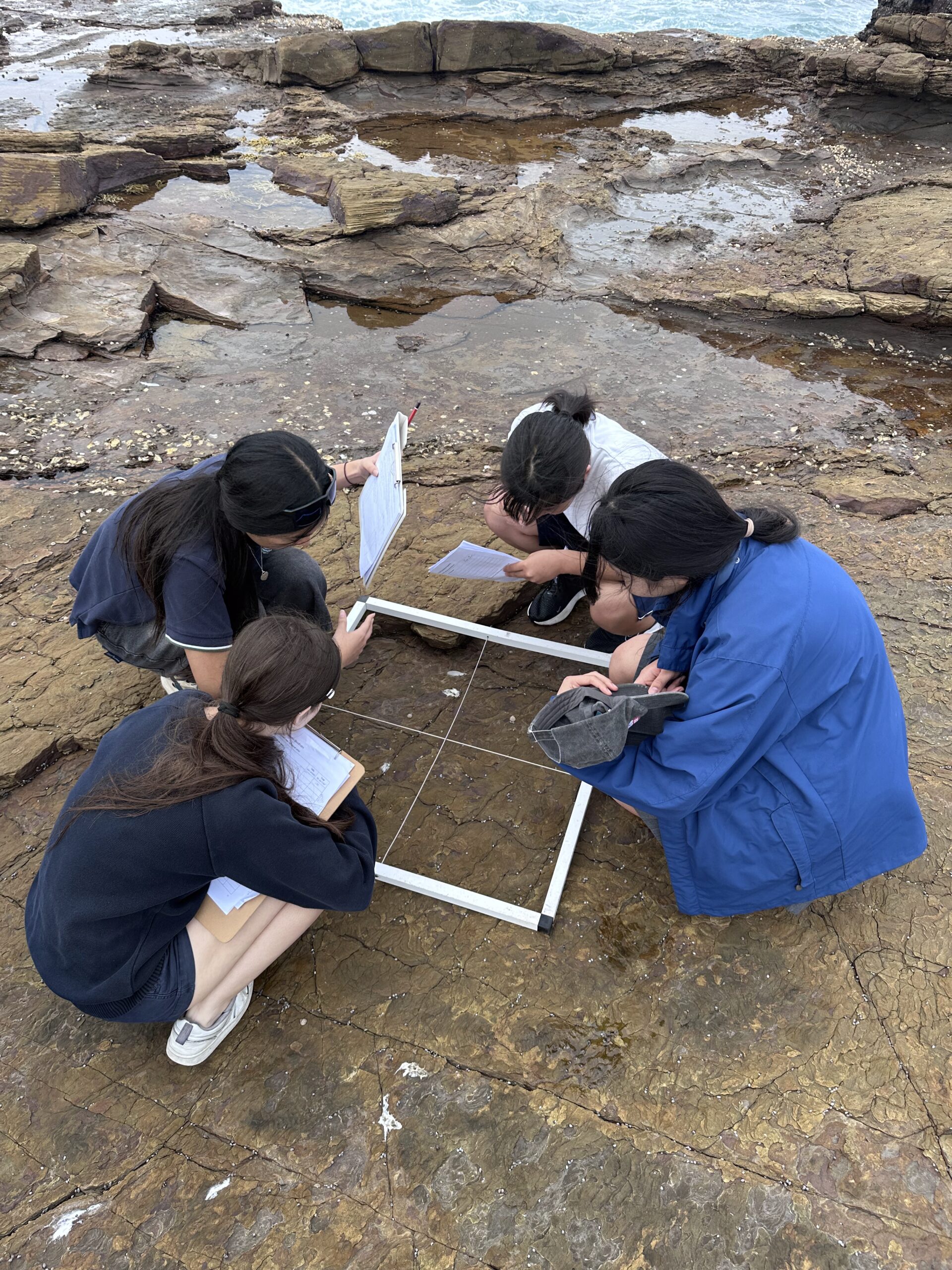 Despite breezy coastal conditions, students engaged in hands-on scientific investigation on the rock platform, measuring animal abundance and distribution and recording field data. They identified a range of marine plants and animals, applying classroom learning in a real-world setting.
