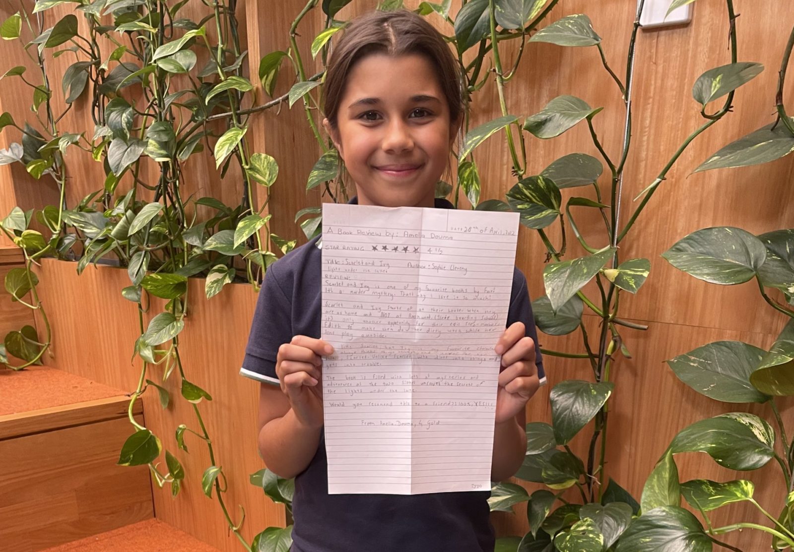 Amelia of Year 4 Gold especially enjoyed Lights Under the Lake, the fourth book in Sophie Cleverly’s spine-tingling historical mystery series Scarlet and Ivy. Amelia said the book is “filled with lots of mysteries and adventures, as the two sisters unravel the secrets of the lights under the lake”. She highly regards the book, giving it a four and half star rating and says that she would 100 percent recommend it to a friend.