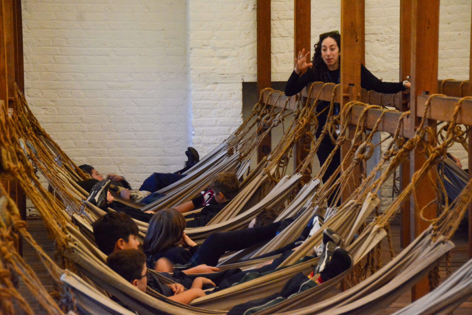 On the ground floor, students talked about what it must have felt like to be a young Irish migrant during the famine coming to Australia in search of a better life—perhaps a bit scary, but also hopeful, they decided. On the first floor, they interacted with objects found in the Barracks that were left behind by convicts: small pieces of clay, cutouts of work uniforms, and handmade musical instruments. Finally, on the second floor, they learned about the impact of early settlers on the Aboriginal people who originally inhabited this land.